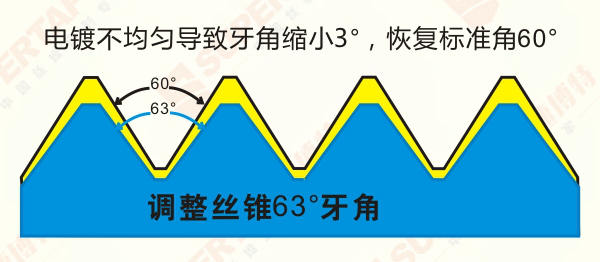 經過改變絲錐的牙形角度,施工出來的牙角度變大,電鍍以后,角度變小,恢復到標準角度。
