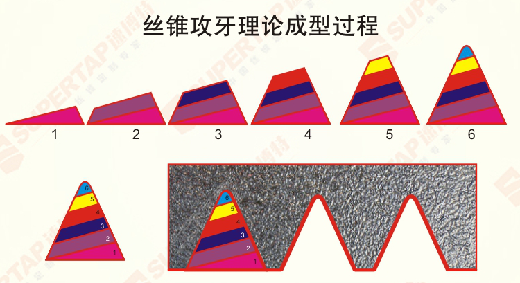 首先,我們來了解一下絲錐攻牙的成型過程,理論上來說,絲錐攻牙是由導(dǎo)牙分多刀切削出來的