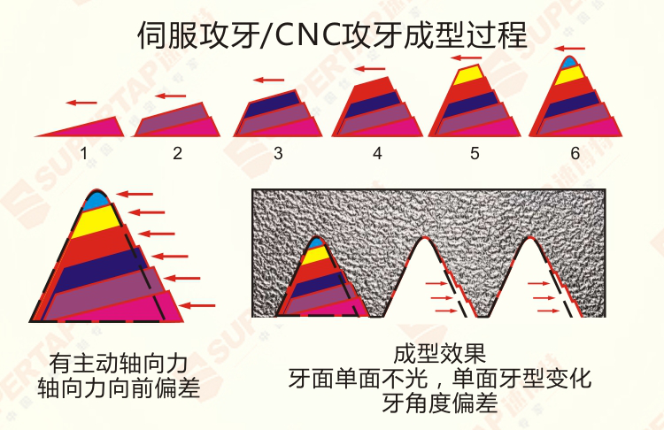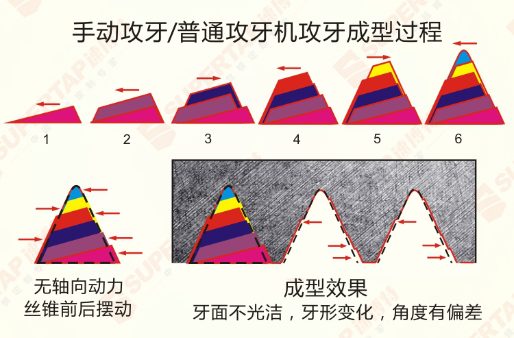 普通絲錐攻牙的時(shí)候,如果沒有軸向動(dòng)力或者軸向動(dòng)力有偏差的話,會導(dǎo)致牙型變形,牙面光潔度粗糙,以及牙角度偏差等問題