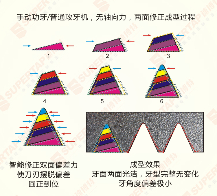 經(jīng)過智能修正技術(shù),絲錐攻出來的螺紋,牙面正反兩面光潔度能達(dá)到0.8,壓角度偏差小于0.15度,牙型完整,沒有不規(guī)則變形。