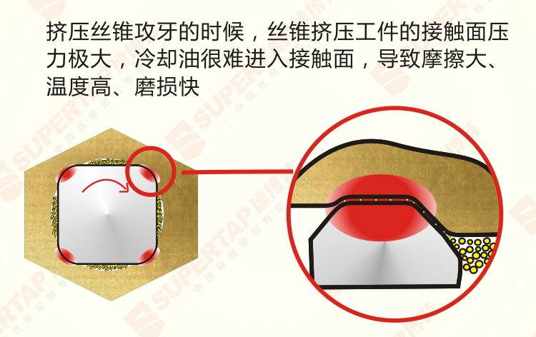 擠壓絲錐是利用工件的可朔性,通過強有力的摩擦擠壓工件,使其變形,產(chǎn)生螺紋。絲錐與工件接觸面之間的摩擦與壓力是非常的巨大的。即使在攻牙的過程中進行油冷,但是接觸面之間由于摩擦與壓力巨大,油是很難進入接觸面之間起到良好的潤滑作用。
